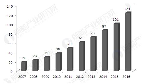 2007-2016年中國(guó)智能照明行業(yè)市場(chǎng)規(guī)模(單位:億元)