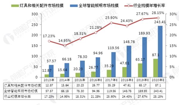 ? 數據顯示,2013年時全球智能照明市場行業規模約57.57億美元,其中燈具和相關配件市場規模約為12.87億美元;2015年全球智能照明市場規模達到78.3億美元,增長十分迅猛。按照當前發展勢頭,預計2020年可達243.41億美元,其中燈具和相關配件市場規模約為87.1億美元,占比超過5%,年復合增長率超過20%。