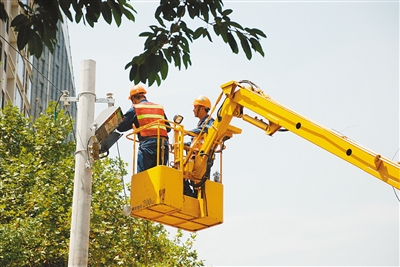 ? 工作人員對(duì)路燈進(jìn)行維護(hù)
