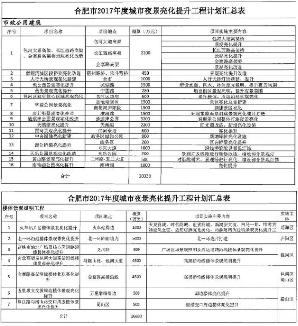 ? 2017年度,合肥計劃實施23項城市亮化工程,主要包括:天鵝湖景區(qū)及周邊區(qū)域、高鐵南站片區(qū)、火車站片區(qū)、金寨路高架、包河大道高架、長江西路高架、包河公園、環(huán)城公園、南淝河及跨河橋梁、樓體亮化提升等。