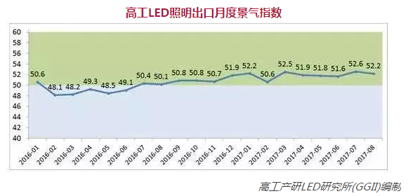 ?8月中國LED照明出口景氣指數為52.2,處于景氣區間,較上月下降0.4個點,這表明8月中國LED照明出口的整體形勢良好,但相比上月有輕微的趨弱,這主要受到中國LED照明出口規模、匯率波動、封裝器件價格走勢、企業LED照明出口業務營收多重因素的影響。