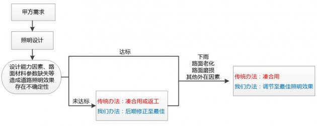 道路照明設計方面:路燈角度可以調節,工程完工后根據路面情況,自動或人工修正至佳的照明效果。因此,設計師無需擔心路面材料參數和理論數據不一致,從而導致照明設計效果和實際效果的差異,照明公司無需擔心照明效果差而遭到甲方苛責;