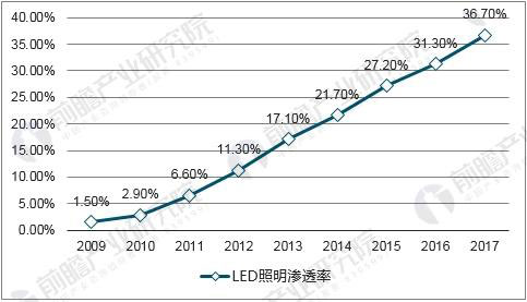 ? 近年來,全球LED市場高速增長,已逐步取代白熾燈、熒光燈等其他照明光源,滲透率持續(xù)快速提升,燈港照明據(jù)新發(fā)布的《LED照明產業(yè)市場前瞻與投資戰(zhàn)略規(guī)劃分析報告》數(shù)據(jù)顯示,2017年全球LED滲透率達到36.7%,較2016年上升5.40%。